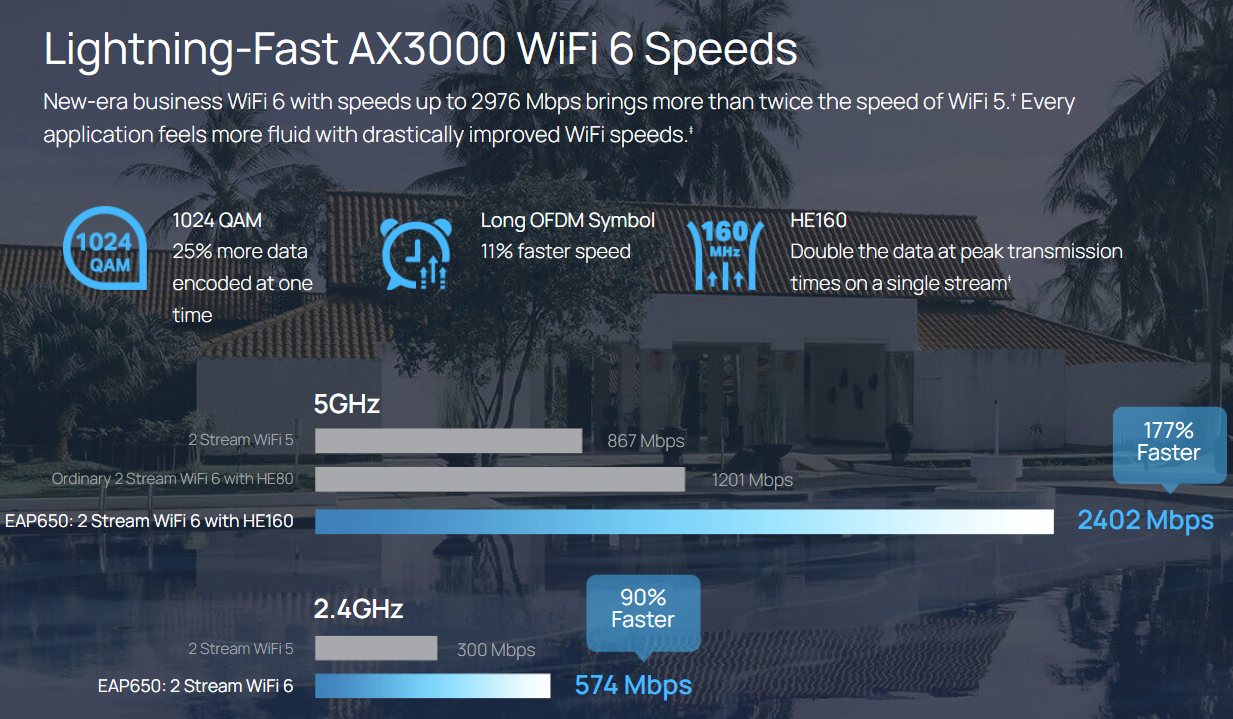 - Ultra-Fast WiFi 6 Speeds: Simultaneous 574 Mbps on 2.4 GHz and 2402 Mbps on 5 GHz totals 2976 Mbps WiFi speeds.