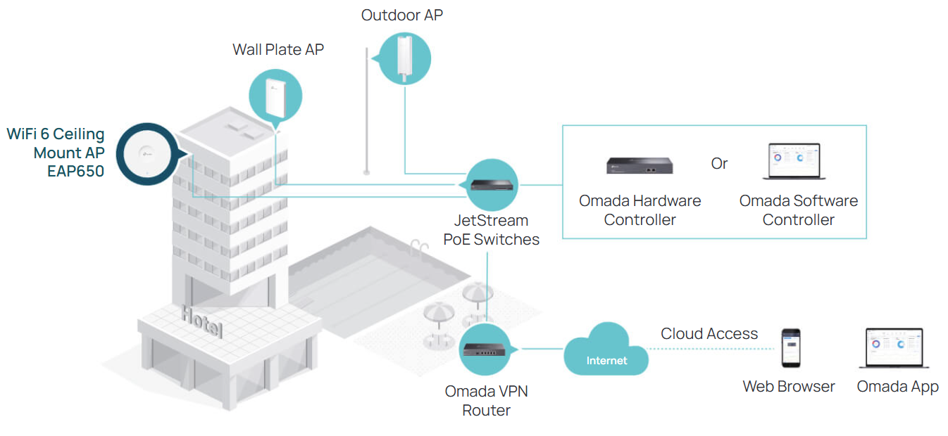 - Centralized Cloud Management: Omada SDN integration manages the whole network locally or from the cloud via web UI or Omada app.