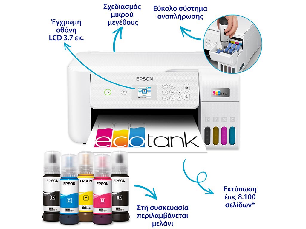 Οι εκτυπωτές EcoTank παρέχουν οικιακές εκτυπώσεις χωρίς ταλαιπωρία: Χάρη στην εξαιρετικά υψηλή χωρητικότητα τους, τα δοχεία μελανιών επιτρέπουν την εύκολη αναπλήρωση, ενώ τα φιαλίδια διαθέτουν σχεδιασμό κλειδώματος, έτσι ώστε να μπορεί να τοποθετηθεί μόνο το σωστό χρώμα.