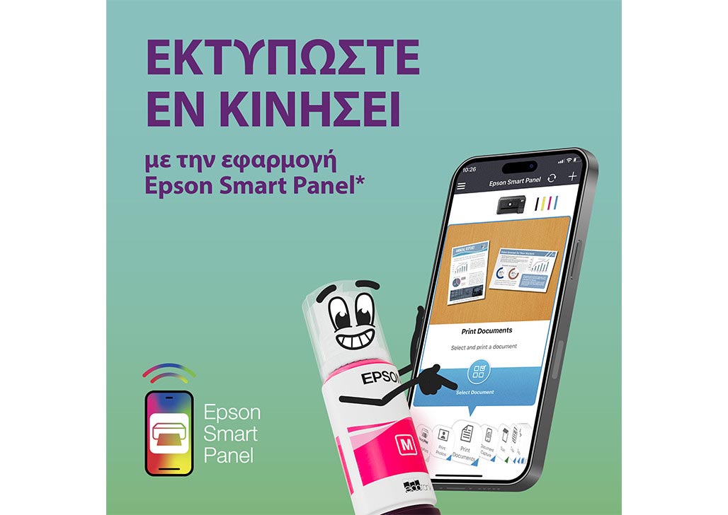 - Εφαρμογή Epson Smart Panel Ασύρματη ρύθμιση, παρακολούθηση, εκτύπωση, σάρωση και άλλες εργασίες μέσω της έξυπνης συσκευής σας