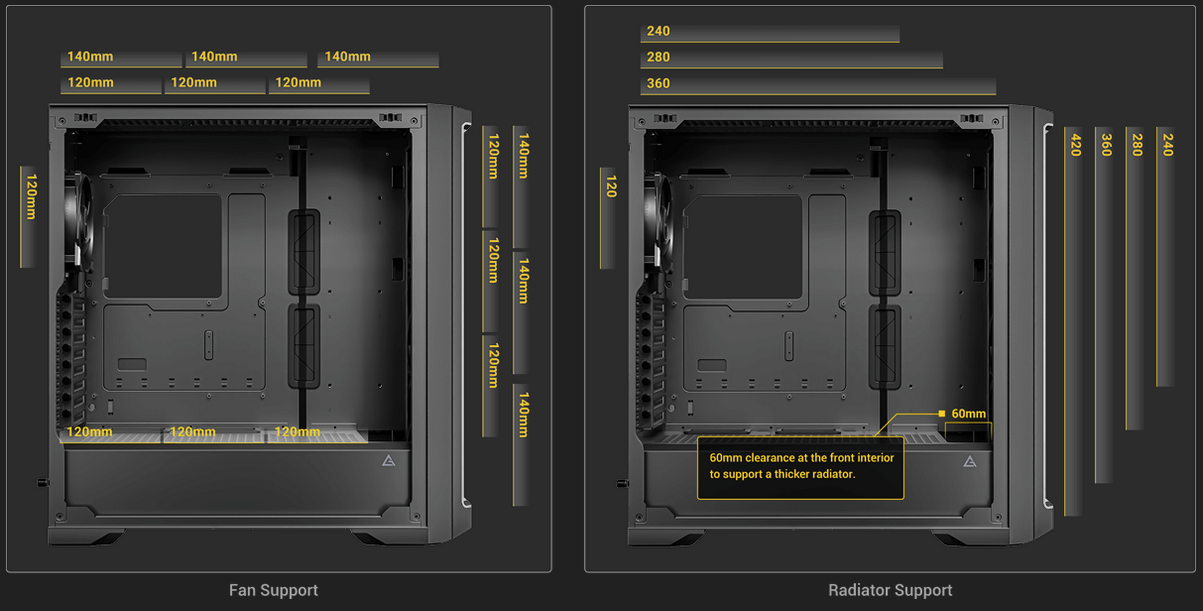 Support a 420mm radiator at the front. (When installing a 420mm radiator at the front, the radiator at the top must be less than 360mm.)