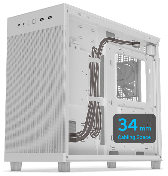 A 34mm-wide compartment behind the motherboard provides ample space to neatly organize cables, despite the relatively compact dimensions of the chassis.