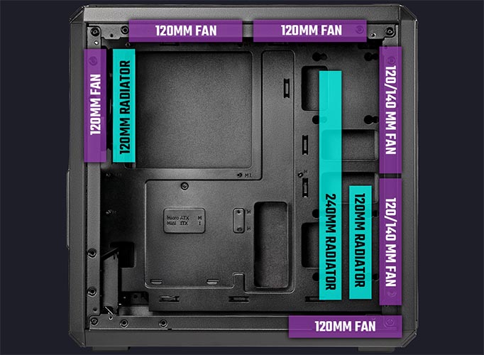 The front supports up to two 140mm fans and up to a 240mm radiator. The rear supports a 120mm fan or radiator and the top two 120mm fans. All to ensure you don't have to compromise on performance.