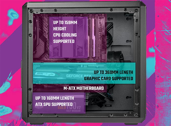 The Q300L V2 case supports CPU coolers up to a height of 159mm, graphics cards up to a length of 360mm, and power supplies up to a length of 160mm.
