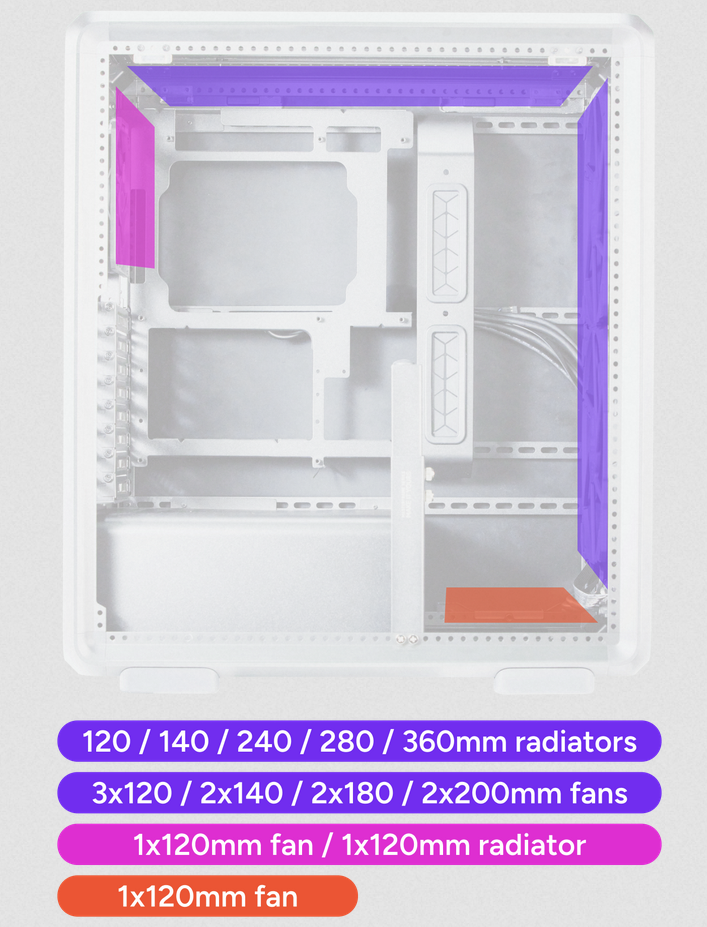 Can house up to eight fans and multiple radiator sizes (up to 360mm), ensuring superior thermal performance.