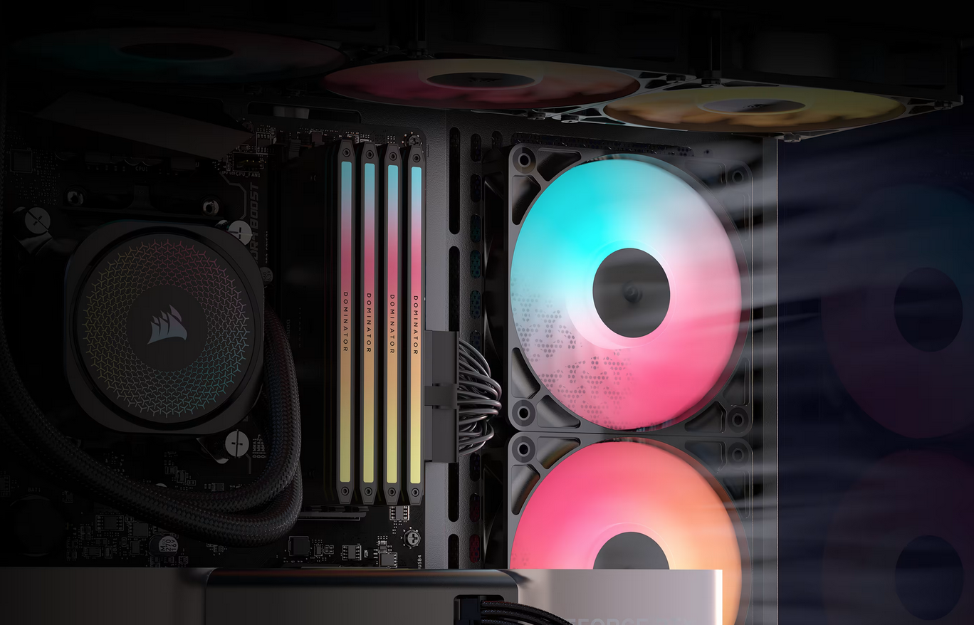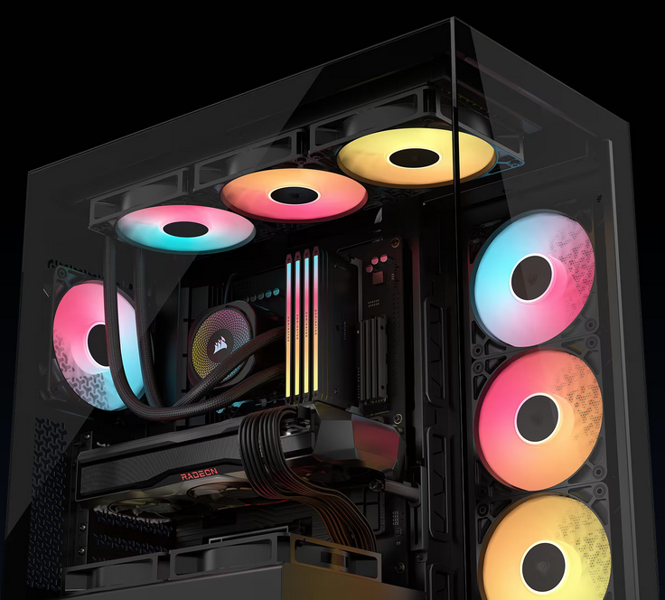 Three RS120-R ARGB fans deliver great cooling and vivid lighting, with daisy-chain connections for simple setup. Their reverse-rotor design keeps the vibrant LEDs fully visible, so lighting effects remain clear and unobstructed. These fans incorporate CORSAIR Magnetic Dome bearings, AirGuide technology, and custom-engineered fan blades, delivering exceptional cooling performance for both radiator and case setups.
