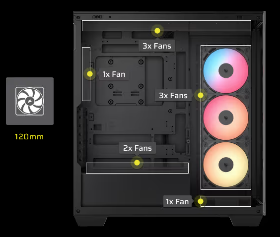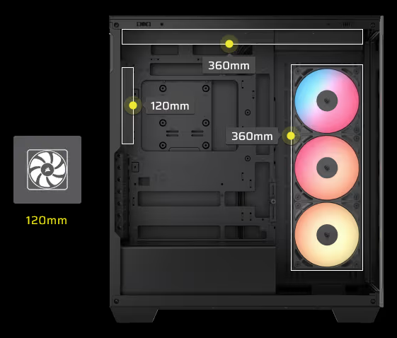 Customize your cooling setup with room for up to 10x 120mm fans, plus versatile radiator mounting options including up to 360mm in the side and roof.