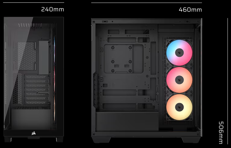| Λοιπά στοιχεία | Dimensions (W x L x H): 506 x 460 x 240 Weight: ~ 10.66 Material: Steel, Tempered Glass Dust Filters: Top, Bottom, Side Expansion Slots: 7 horizontal (or 4 vertical) Included Fans 3x 120mm Included - RS120R ARGB (Side Mounted) Fan Compatibility Top: 3x 120mm / 2x 140mm Bottom: 3x 120mm / 1x 140mm Rear: 1x 120mm Side: 3x 120mm / 2x 140mm Radiator Compatibility Top: 360mm / 280mm / 240mm Bottom: 120mm Rear: 120mm Side: 360mm / 280mm / 240mm Clearance Maximum PSU Length: 180mm (ATX) Maximum CPU Cooler Height: 170mm Maximum GPU Length: 410mm |