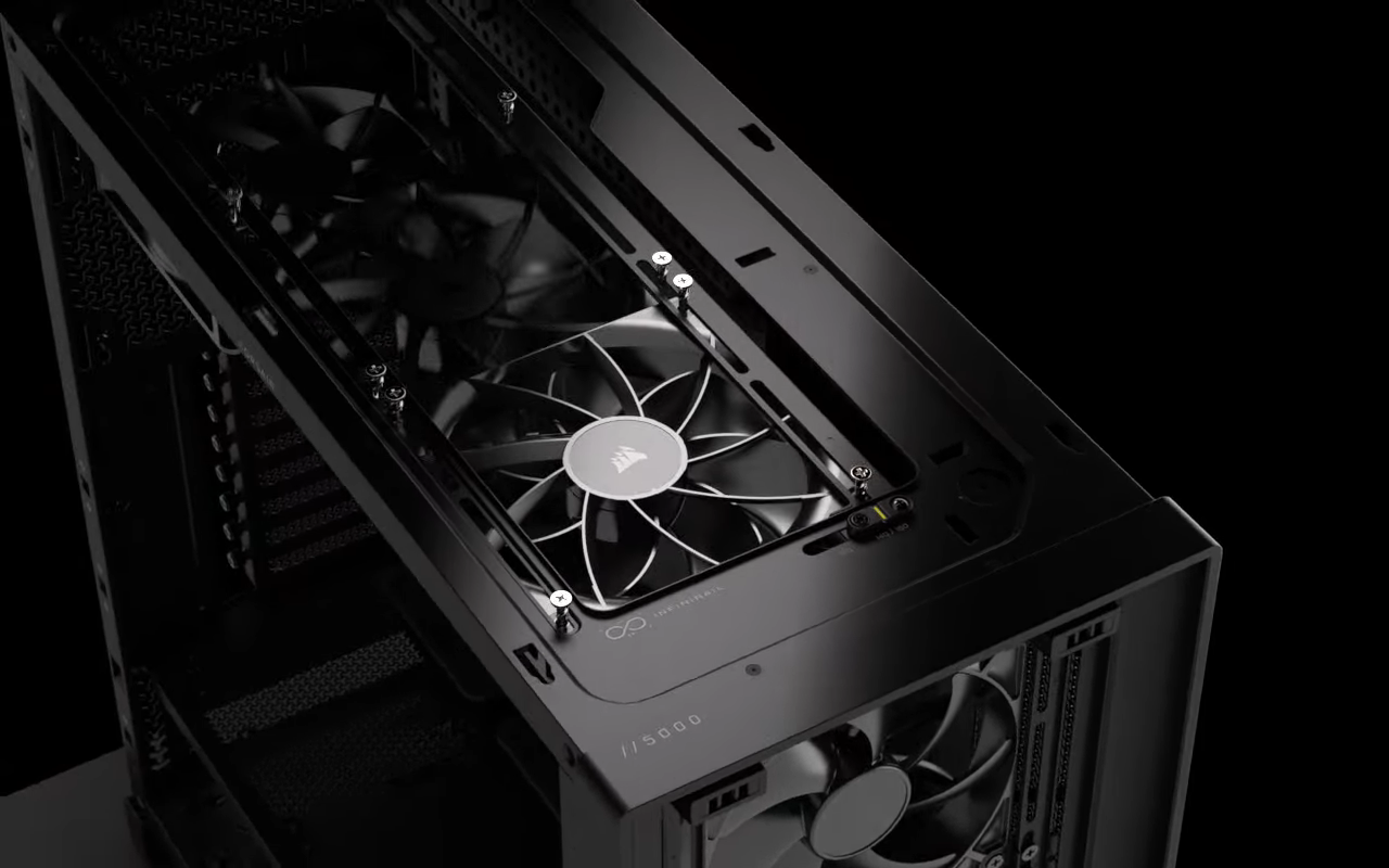 The CORSAIR FRAME 5000D RS is a modular and spacious mid-tower PC case featuring InfiniRail Fan Mounting System, RapidRoute 2.0 cable management, and is compatible with reverse connector motherboards.