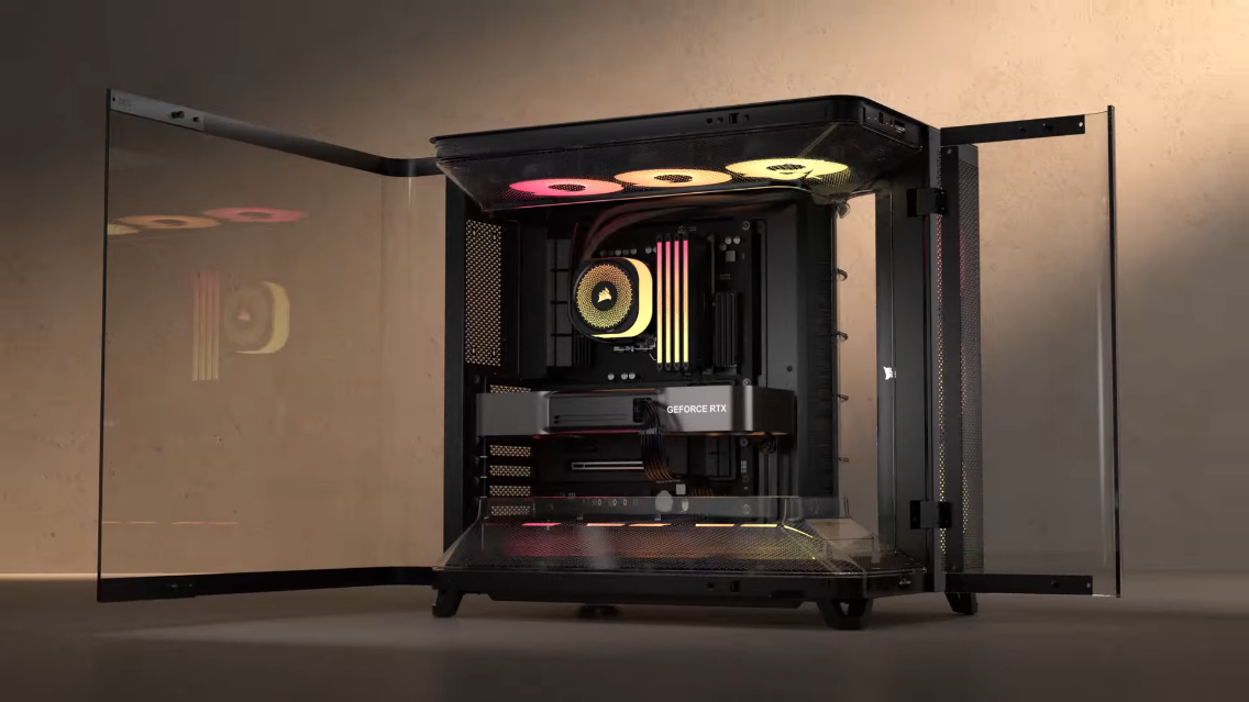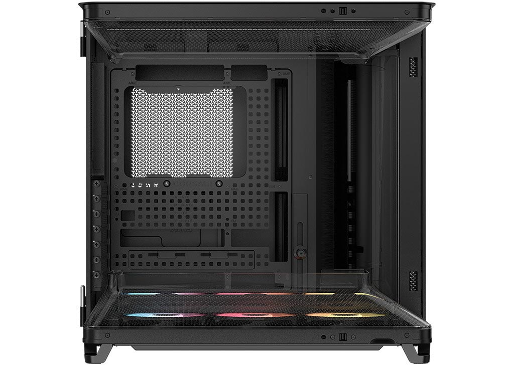 Two glass panels connect in the corner of the chassis and open outwards with hinges that disappear for a seamless look and easy access to your hardware.