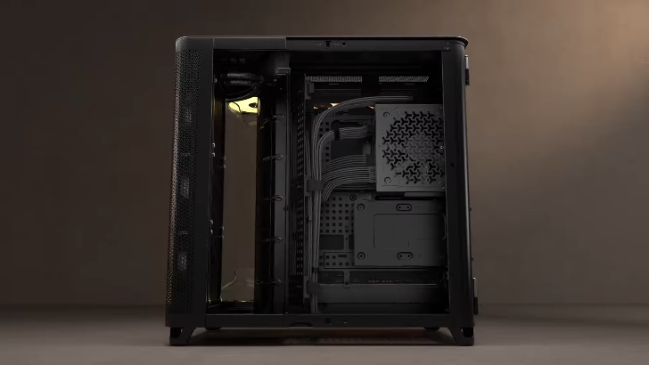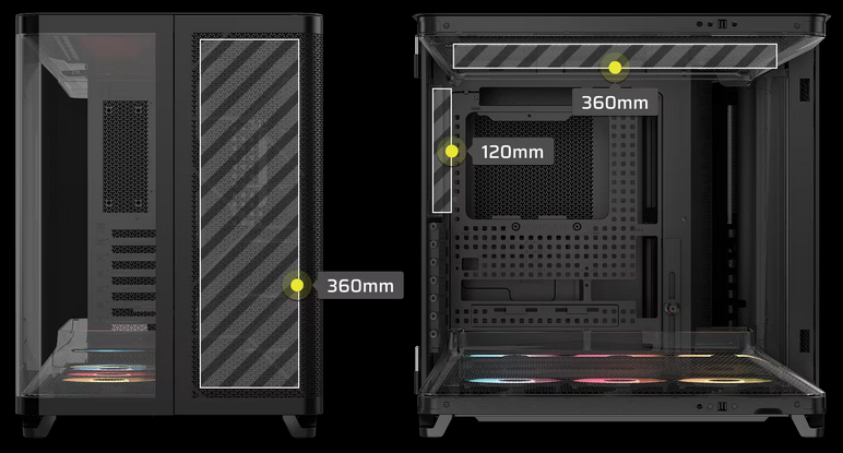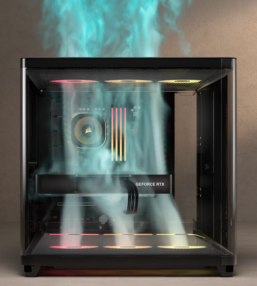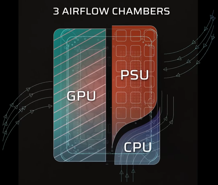 A unique triple-chamber design was created to isolate hot components for effective cooling and maximum performance at all times. Separate chambers for the CPU, GPU/motherboard, and PSU, cables, and storage allow for exceptional thermals and an easy PC building process.
