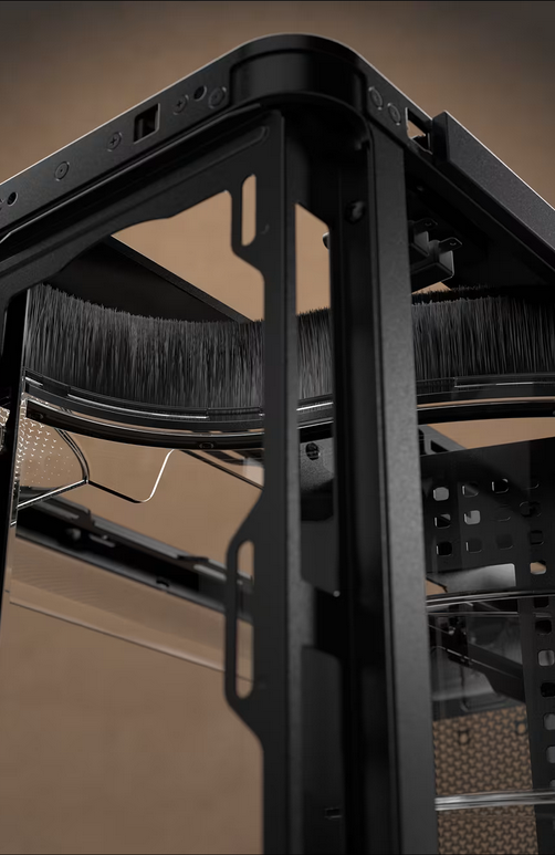 Nylon brushes between the chambers allow for easy cable routing without any gaps to spoil the aesthetic.