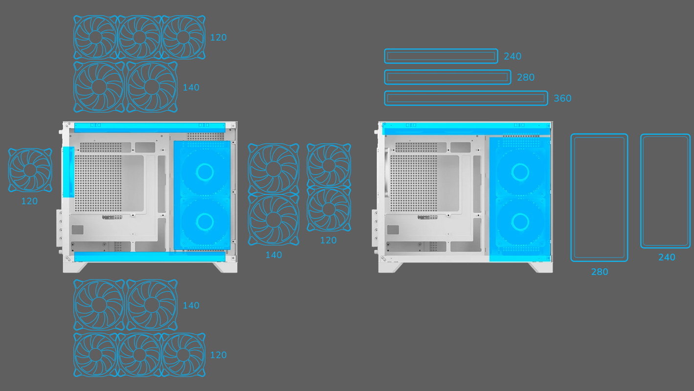 Keep your components performing at optimal temperatures even under high load. The FV150 Mini has a capacity of 3 x 120mm or 2x140mm on the top and bottom, 2x120mm or 2x140mm fans on the side, and 1 x120mm on the rear. Water cooling support maxes out at 360mm on top and 240mm on the side.