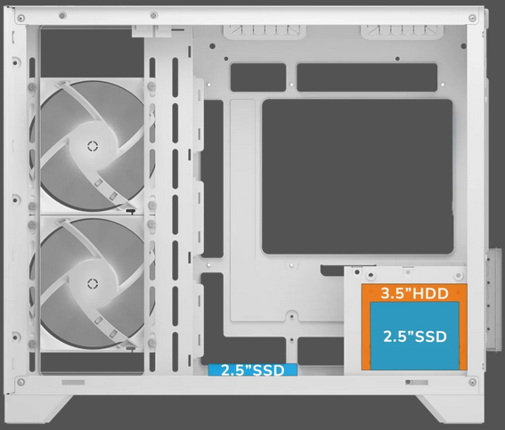 | Εσωτερικές Θέσεις | 2x 2.5" 1x 3.5" - Note: When a 3.5" HDD is installed in the right-side drive cage, a 2.5" SSD cannot be installed at the bottom. |