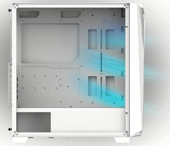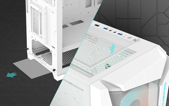 The GIGABYTE C301 GLASS WHITE V2 comes with the large mesh front and the vented top panel, delivering generous airflow for optimized cooling with premium aesthetics.