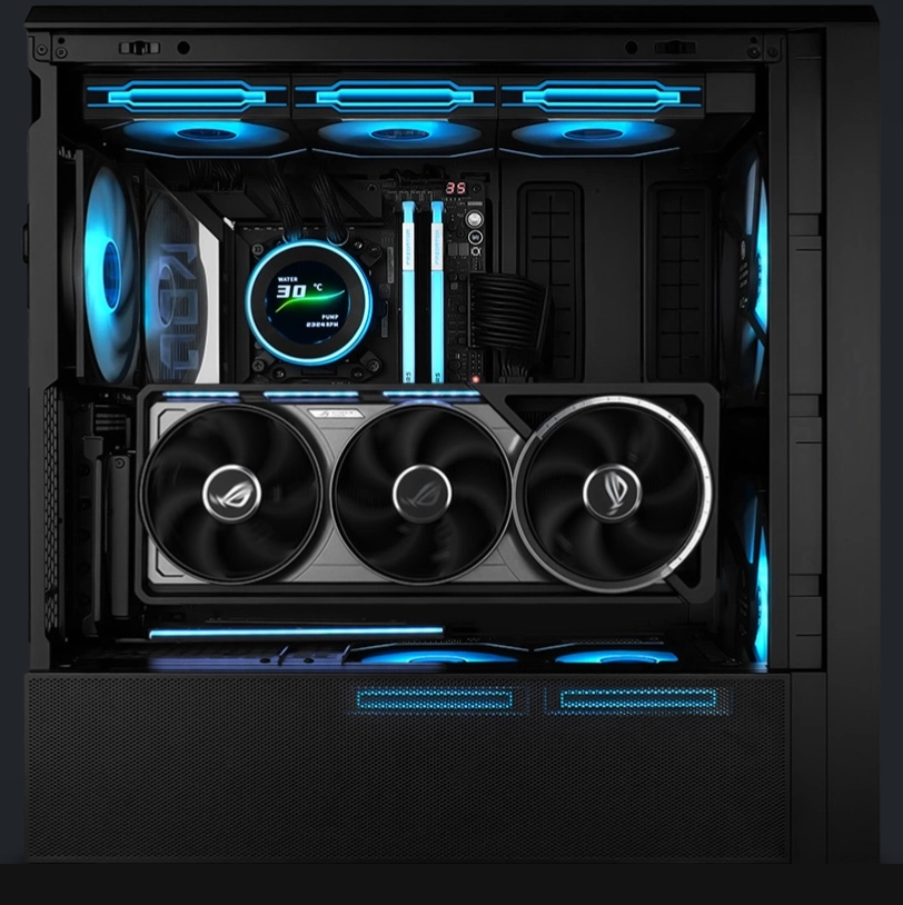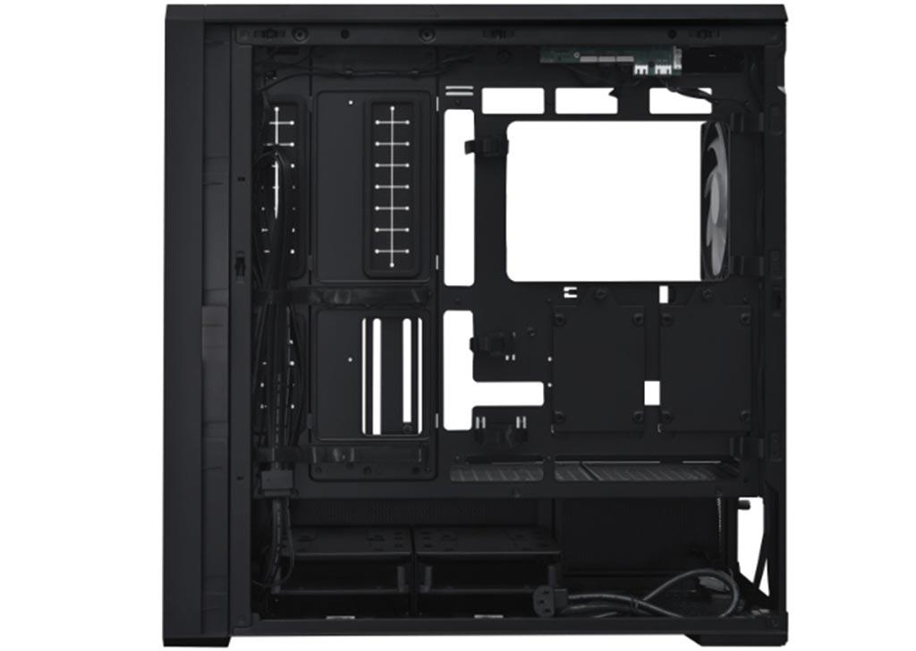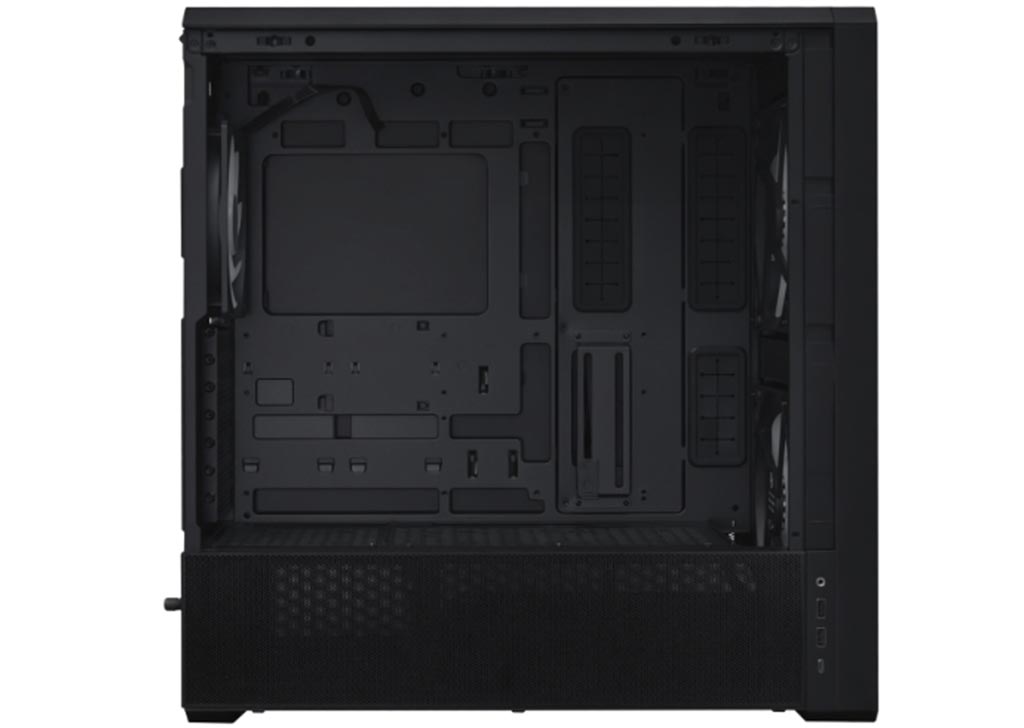 The PCIe slot bracket can be turned 90 degrees to support vertical GPU mounting. In this setup, the bottom fan can be moved under the PSU shroud for a hidden look, giving users more flexibility when building their system.