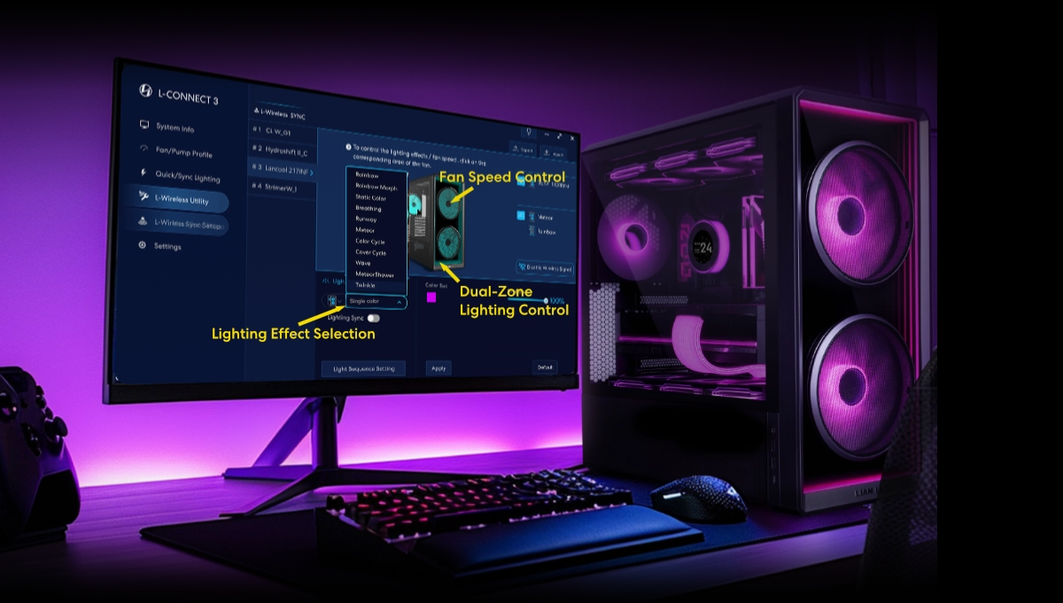 With L-Connect 3, users can wirelessly control fan speed and ARGB lighting, including the front panel’s infinity mirror. When paired with the L-Wireless controller, it delivers synchronized lighting effects across compatible devices for a seamless and immersive setup.