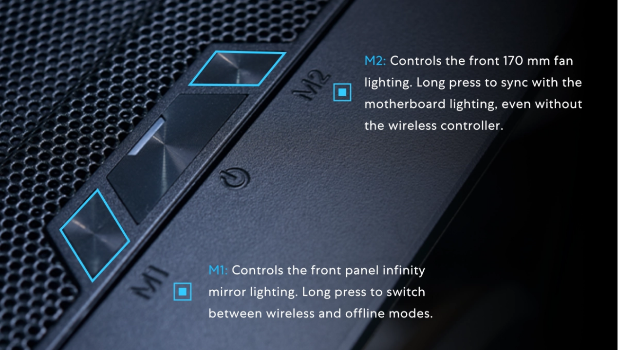 The top I/O panel integrates an M1 button for front panel lighting and an M2 button for fan lighting effects, allowing easy customization of illumination styles.