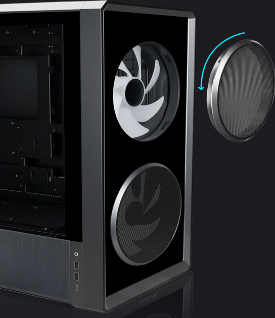 The front fans come with a metal mesh dust filter that prevents dust intake and accidental fan contact. The filter can be easily detached for quick cleaning.