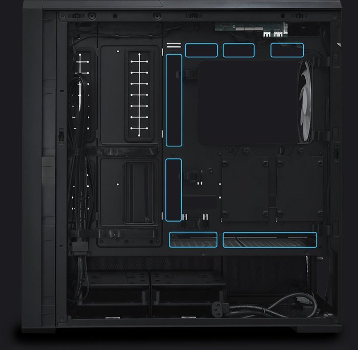 Alternatively, two 120 mm fans can be installed beneath the PSU cover to create more space and improve internal cooling flexibility.