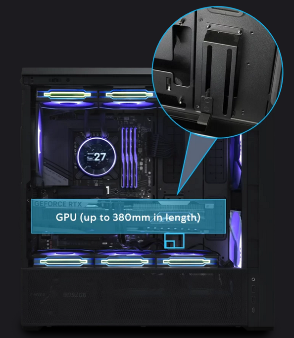 The LANCOOL 217 INF supports GPU up to 380mm in length and features an adjustable anti-sag bracket, ensuring a perfect and secure fit for GPU.
