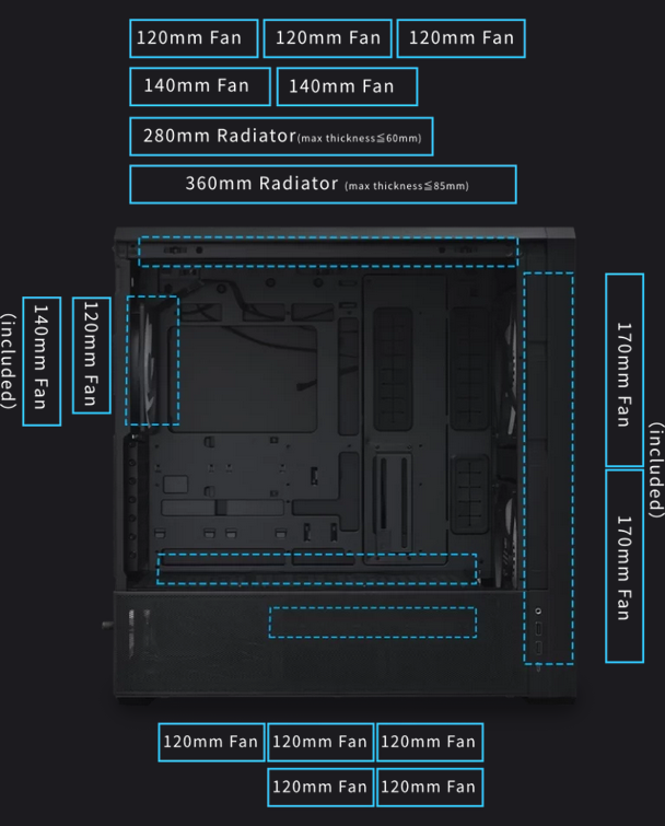 The LANCOOL 217 INF offers excellent compatibility. In addition to the included 170 mm and 140 mm fans, it supports multiple additional fans and accommodates up to a 360 mm radiator with a total thickness under 85 mm.