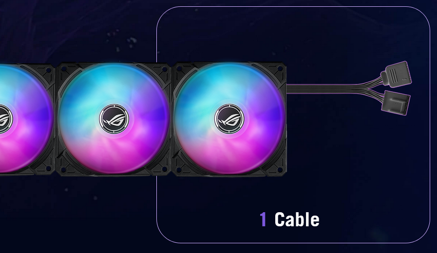 Daisy-chained ARGB fans dramatically reduce cable clutter from six cables down to one. A single connection now delivers power to both the ARGB lighting and fan motor for a cleaner, faster installation.