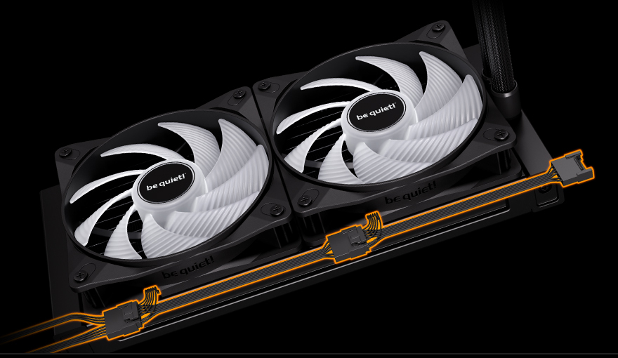 Pure Loop 3 LX 240mm features 2 Light Wings LX 120mm PWM high-speed fans. They come with 16 LEDs that perfectly scatter across the fan blades and are key for the stunning visuals Pure Loop 3 LX 240mm offers. The fan’s 9 airflow-optimized fan blades not only reduce noise-generating turbulences but also ensure that Light Wings LX 120mm PWM high-speed provides the performance that is needed, even in demanding scenarios. A specially designed, funnel shaped air outlet is more than just the icing on the cake: it maximizes the airflow over the fins. The fans also come with a “closed loop motor” function. This feature always keeps a steady fan speed, no matter the resistance - ideal for radiators.