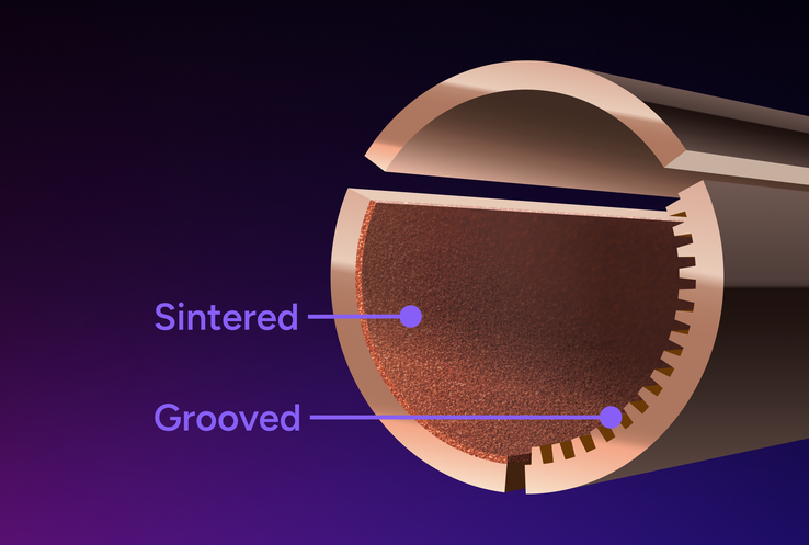 3DHP heat pipes use a hybrid internal structure that combines sintered powder and grooved channels in varying textures and sizes. Each section is optimized for a specific phase—evaporation, condensation, or liquid return—resulting in more efficient heat transfer than traditional designs.