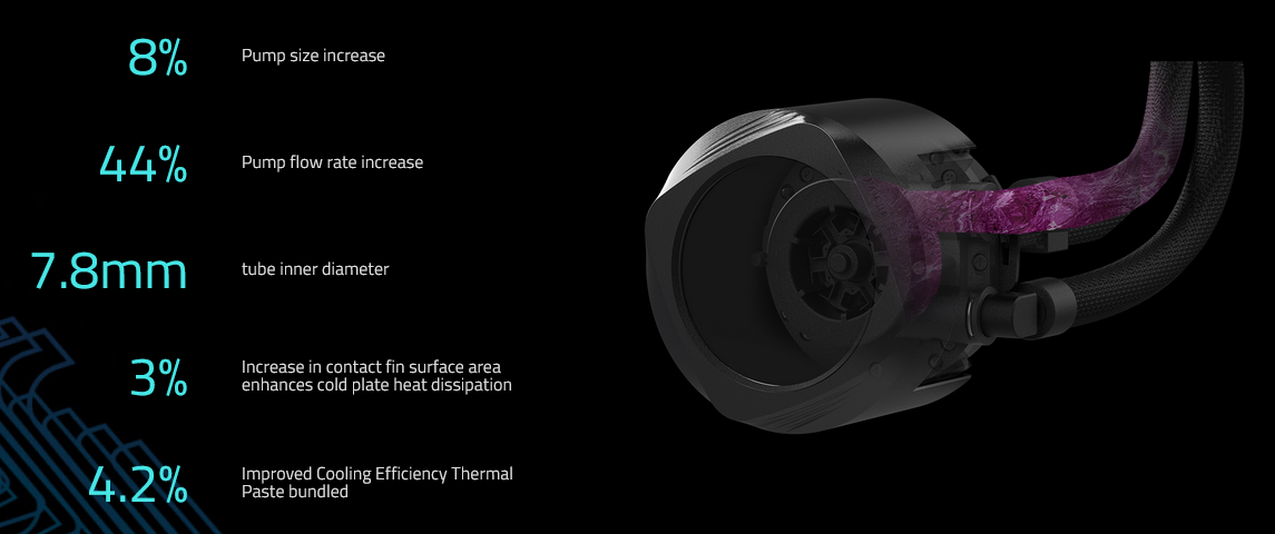 Gear up for unmatched cooling power with boosted performance across the board - power, flow, pipes, and plate area, all fine-tuned for the ultimate heat-busting experience!