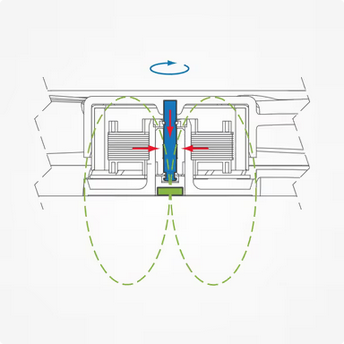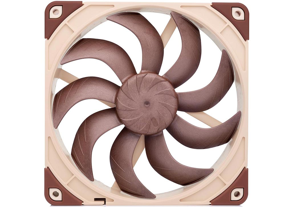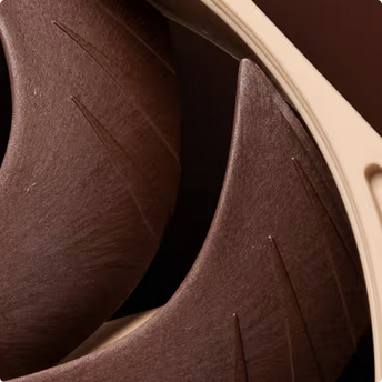 The NF-A14x25 G2 features a unique Progressive-Bend impeller with Flow Acceleration Channels and winglets. Its nine blades are swept backwards close to the hub and progressively bent forward further out. Working in tandem with the Centrifugal Turbulator hub, this design not only helps to push more air towards the outer blade areas where efficiency is higher but also assures maximum lift and near uniform loading across the entire blade span.