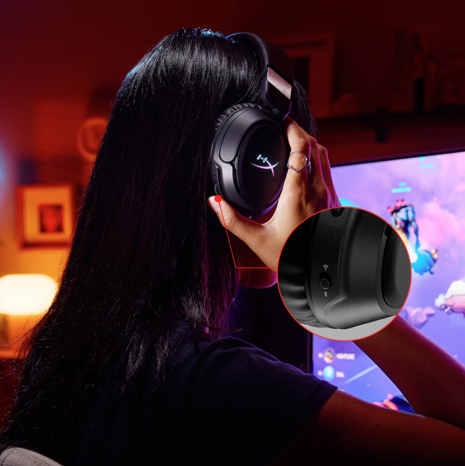 The HyperX Cloud Flight 2 lights up every match with full-panel RGB paired with magnetic ear-cup plates you can pop off and swap in seconds — no tools, no downtime. Change the look, save one lighting profile onboard, and match your headset to your playstyle, rank, or stream setup. Designed for endurance, turn the lighting off to conserve battery and keep going with up to 100 hours of 2.4 GHz gameplay or 150 hours via Bluetooth. Instant Pair support lets you connect to select OMEN laptops without a dongle, while a simple switch toggles between 2.4 GHz wireless and Bluetooth modes. Stay comfortable through every round with plush memory foam ear cushions, 90° rotating earcups, and steel sliders built to withstand daily wear. The angled 50 mm drivers deliver immersive, game-optimized sound. Use the detachable 10mm boom mic for clear communications or go boomless with the built-in mic when you’re off duty. Onboard controls for audio, microphone, media, and lighting put you in control with convenience — no menus, no distractions. Whether you're gaming, streaming music or videos, browsing Twitch, or completing assignments, the HyperX Cloud Flight 2 keeps you comfortable and stylish with all-day comfort and customizable RGB.