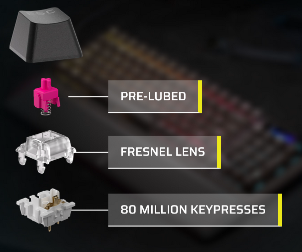 Wobble-free CORSAIR MLX Plasma keyswitches feature pre-lubricated stems and Fresnel lensing for stunning RGB lighting. Refined for top-tier responsiveness and rated for 80 million keypresses. It also allows you to hotswap in your choice of compatible 3-pin and 5-pin mechanical keyswitches.