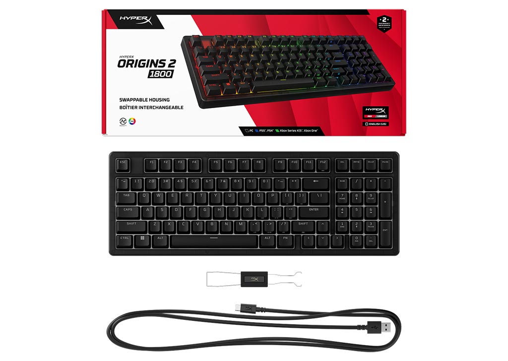 | Λοιπά στοιχεία | Keyboard Specifications Actuation Point: Mechanical Backlight: RGB (16,777,216 colors) Light Effects: Per key RGB lighting and 5 brightness levels Onboard Memory: 3 profile Polling Rate: 8000Hz Anti-ghosting: 100% anti-ghosting Rollover: N-key Acceleration: Yes(FN Layer) Game Mode: Yes Compatibility: PC; PS5; Xbox Series. Software Compatibility: NGENUITY. Switch Specifications Switch: HyperX Red Switch - Linear Operation Style: Linear Actuation Point: 40g Total Travel Distance: 4.0mm Physical Specifications Width: 387.9 mm Depth: 139.7 mm Length: 45.9 mm Weight: 955g (with cable) Cable Type: USB-C to USB-A; Braided. Cable Length: 1,8 m What’s Included in the Box Origins 2 1800 Keyboard, USB-C to USB-A Cable, Switch and Keycap Puller Tool, QSG. |
