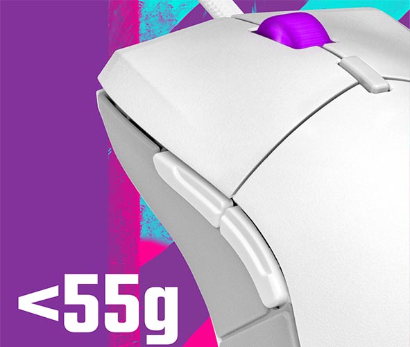 Optimized for right-handers with two side buttons and weighs in at <55g without exterior holes that compromise on aesthetics.
