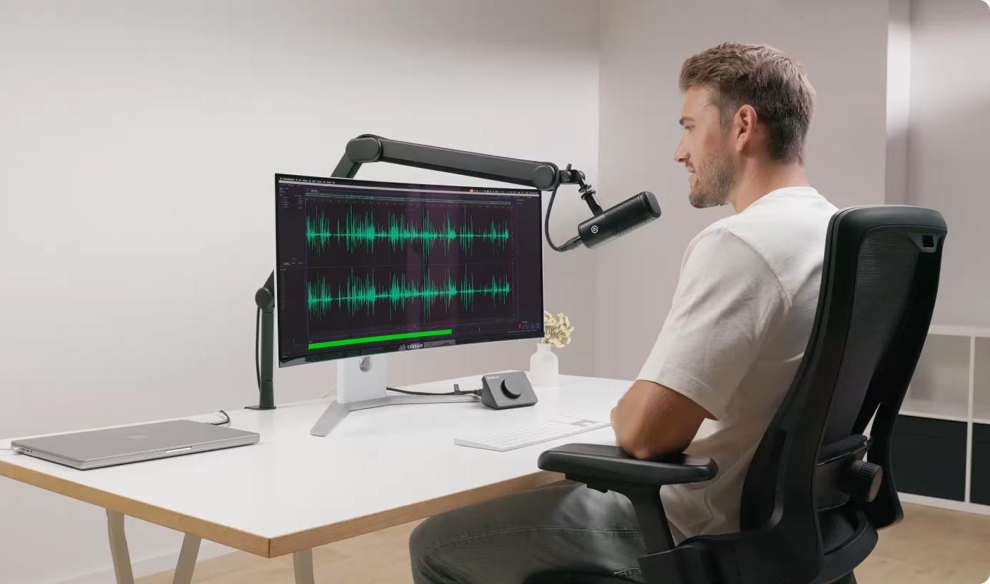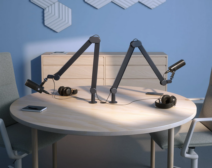 From lightweight condensers to heavy dynamic mics, Wave Mic Arm handles them all with ease. It ships with 3/8" and 5/8" adapters to fit virtually any microphone or shock mount, supporting weights from 200 g up to 1.2 kg.