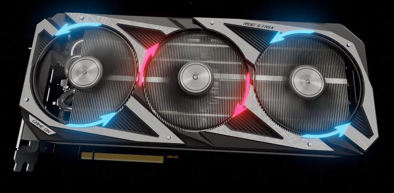 From top to bottom, the ROG Strix GeForce RTX™ 3080 has been radically improved to accommodate the impressive new NVIDIA Ampere architecture and to deliver the next wave of gaming performance innovation to the market. A fresh design and more metal surrounds a grouping of Axial-tech fans. Last gen’s uniform fan layout has been usurped by a new rotation scheme and specialized roles for central and auxiliary fans. Below the blades, a larger, more impressive heatsink is ready for the most demanding thermal loads. The PCB has some new tricks up its sleeves, and even the backplate has received some performance-boosting changes. You've been waiting for the latest and greatest in graphics card design - and this is it.