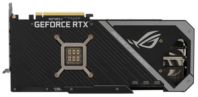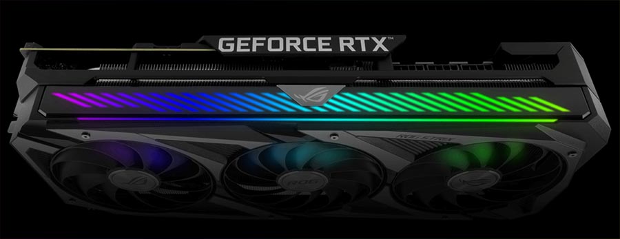 Careful attention has been paid to the front of the GPU, as it’s the most visible part of the card in typical configurations. A new addressable RGB element can be customized with Armoury Crate to create a uniform look along with other ROG components. To fulfill the power demands of the GeForce RTX 3080, three 8-pin power connectors are present, along with an onboard circuit that monitors PSU rail voltage. The circuit is fast enough to catch any transients that result in the rail voltage dropping too low. If that happens, a red LED will light up to indicate a power supply issue. The Strix’s reinforced metal frame is also visible here, adding a literal layer of durability.