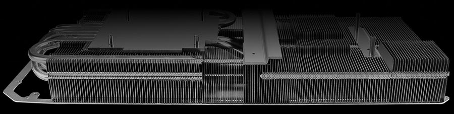 The heat spreader draws heat up into heatpipes that carry it through a fin stack that fills a large 2.9-slot footprint. Increasing the heatsink size compared to the last generation provides more thermal headroom to account for the new high-performance chipset.