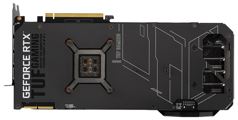 The underside is swathed in a protective metal backplate featuring a wide vent that directs heat towards the airflow of chassis fans. Beneath the GPU, a bracket provides consistent mounting pressure between the die and heat spreader. Stainless steel is used for the I/O bracket to protect ports and provide a more secure mount. And a conveniently placed Dual Bios switch makes it easy to flip between quiet mode or the default performance profile, without requiring software.