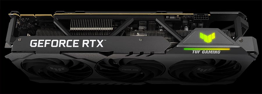 The top-side RGB element can be customized to display a range of aesthetic and functional effects that can also be synced with other ASUS components. To fulfill the power demands of the GeForce RTX 3090 Ti, one 16-pin connector is present, along with onboard LEDs that light up if PSU PCIe power connectors are not plugged in correctly.