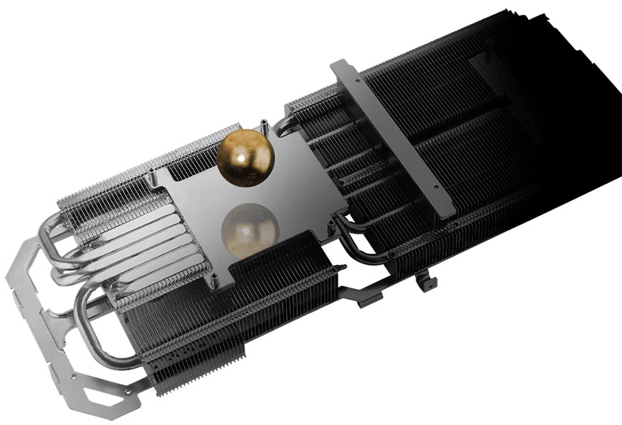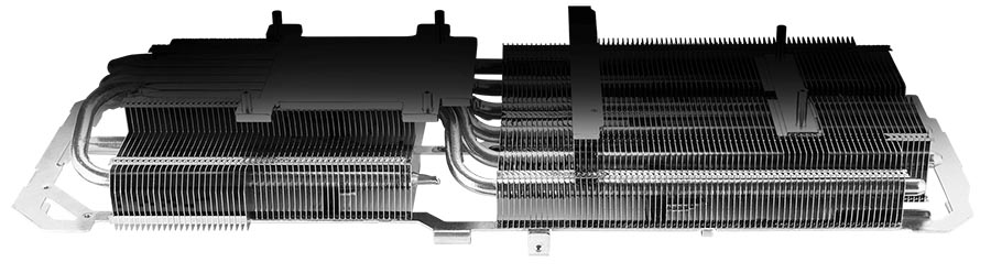 The two side fans spin counterclockwise to reduce turbulence. And to eliminate unnecessary noise, a stop mode halts all fans when the GPU temp falls below 50 degrees and power consumption is low.