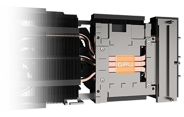 The shape of the pure copper heat pipe maximizes the direct contact area with the GPU. The heat pipe also covers the VRAM through a large metal plate contact to ensure proper cooling.