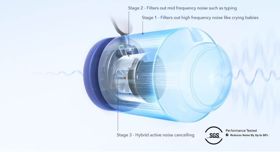 The ultra-wide, 3-stage noise cancelling system targets and blocks out noises precisely.