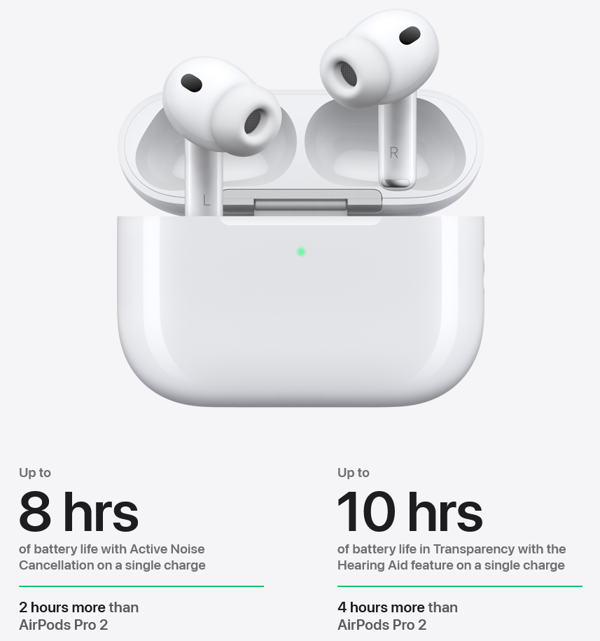 AirPods Pro 3 bring improvements to the world’s first end-to-end hearing health experience. Now you can take a scientifically validated Hearing Test in a broader range of background conditions. The Hearing Aid feature adds improved voice clarity, automatic Conversation Boost, and 67 percent more battery life in Transparency on a single charge. And active Hearing Protection helps prevent exposure to loud environmental noise.