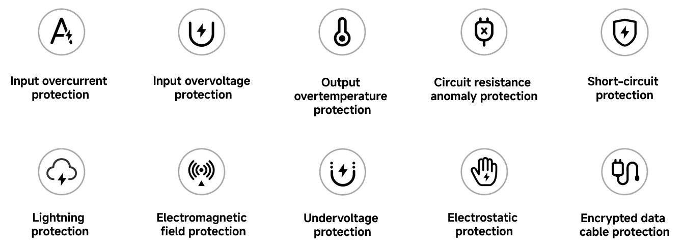 A fire&high-temperature resistant casing, combined with an intelligent temperature control system and 10 layers of safety protection, ensures charging safety.