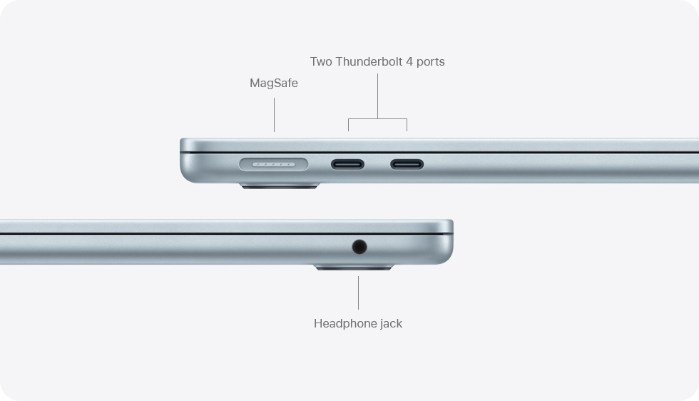 The MagSafe charging cable attaches and detaches magnetically, preventing any unintended flights. Two Thunderbolt 4 ports let you connect high‑speed accessories and charge your Mac. The headphone jack supports high‑impedance headphones. And the Apple N1 wireless chip provides Wi‑Fi 7 and Bluetooth 6, improving performance and reliability.