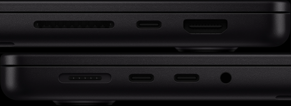 MacBook Pro packs an array of ports for connecting high-speed peripherals, driving high-resolution displays, or directly offloading SDXC cards. Models with the M5 chip feature Thunderbolt 4. Models with M4 Pro or M4 Max feature Thunderbolt 5, which offers transfer speeds of up to 120Gb/s.