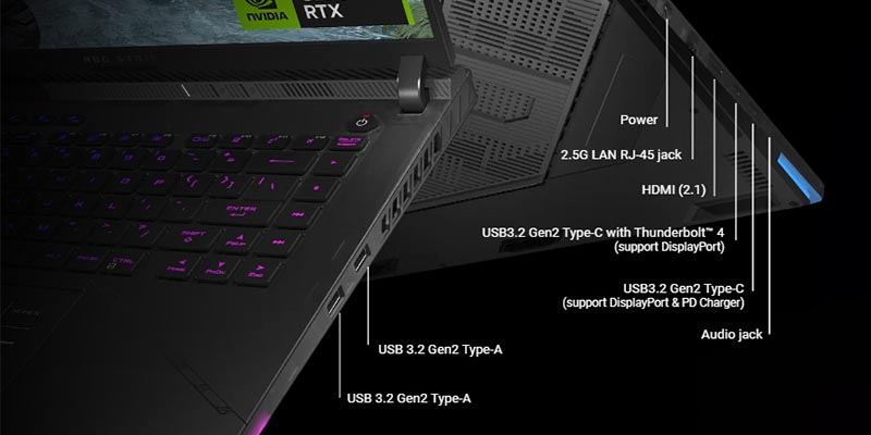 When you need to plug into the big screen, the dedicated GPU powers an HDMI 2.1 port for the latest TVs and monitors, increasing total bandwidth from 18 to 48Gbps, and supporting up to 4K 120Hz and 8K 60Hz content. Two USB Type-C ports allow for plenty of connectivity—one for DisplayPort and power delivery, and a second with Thunderbolt 4 support.