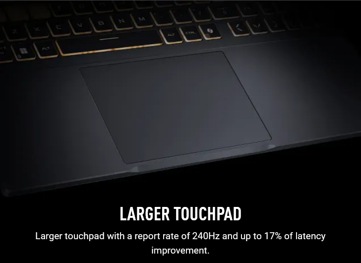 Arm yourself with a desktop-style keyboard optimized for gaming. One Zone RGB backlighting lets you brilliantly express your own unique style. Overstroke technology triggers higher in each keystroke for faster responsiveness and effortless control. In true TUF form, each key is durable enough to withstand over 20 million presses for superb long-term reliability and precision. The touchpad also has a report rate of 240Hz, giving the system more information on what you’re scrolling for and reducing accidental misclicks.